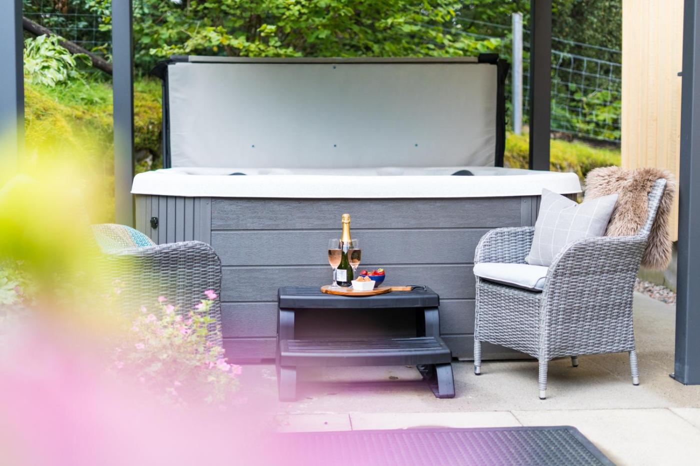 Two-Bedroom House with Hot Tub. There is a king-size bedroom on the ground floor and a double bed on the first floor with a small balcony. The ground-floor bathroom features a luxury Grohe power shower, and there is a 2-person bath with mood lighting upstairs.bedding and towels are high-quality Egyptian cotton, and bathroom toiletries are from the local company The Highland Soap Company.