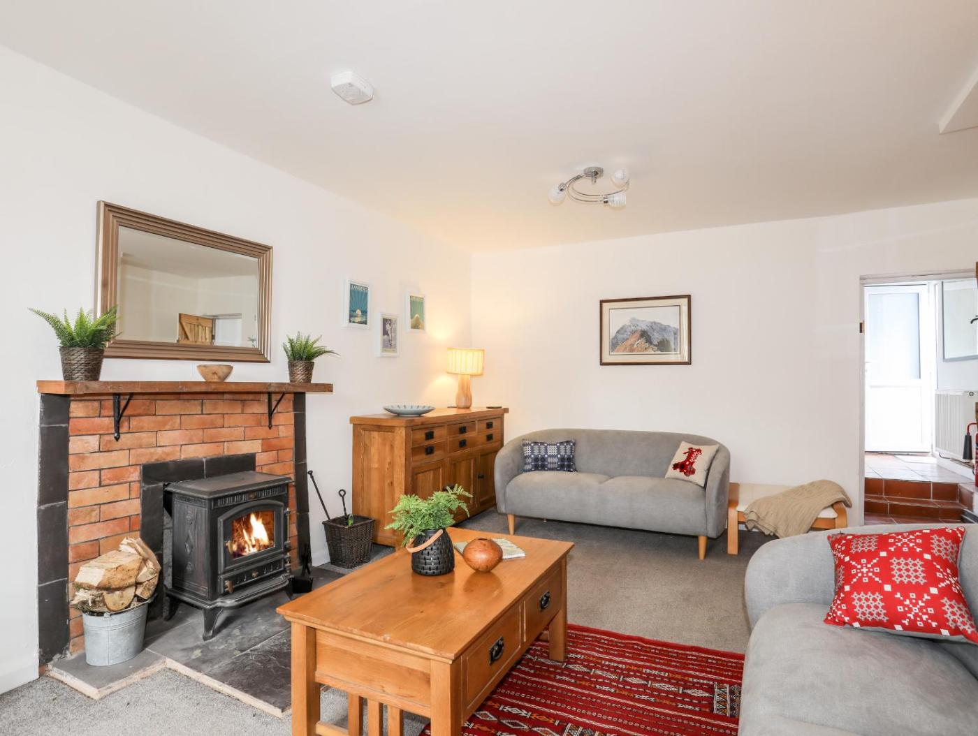 The holiday home features 2 bedrooms, a TV, a fully equipped kitchen with an oven and a microwave, a washing machine, and 1 bathroom with a walk-in shower. There is also a seating area and a fireplace.