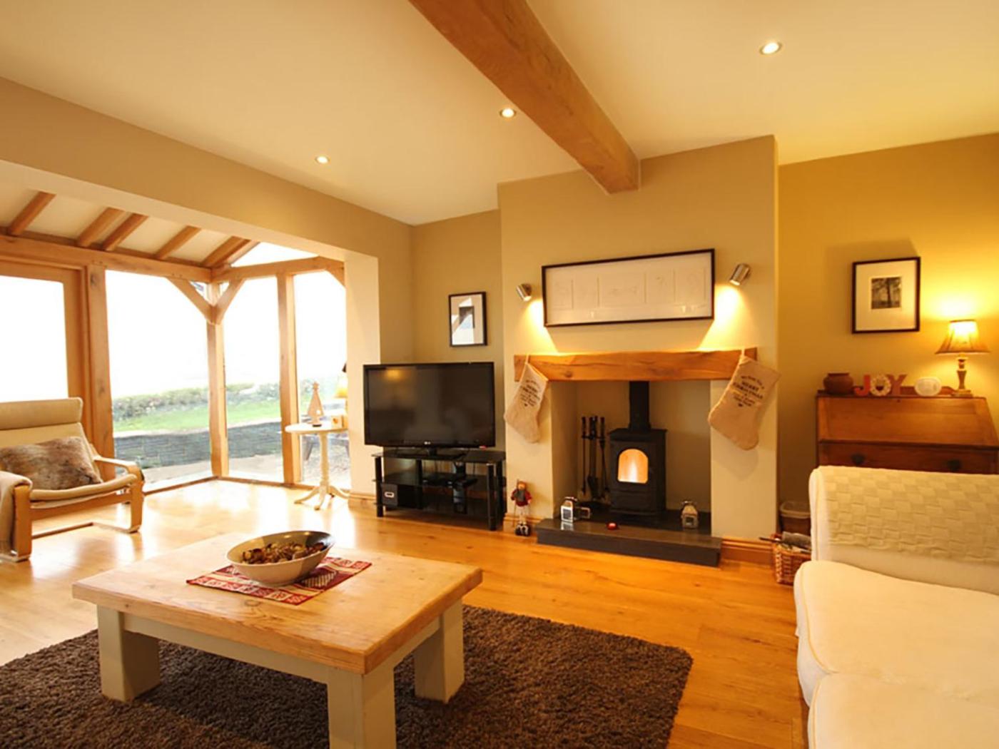 The spacious holiday home features 4 bedrooms, a fully equipped kitchen with a dishwasher and a fridge, and 3 bathrooms with a shower. There is also a seating area and a fireplace.