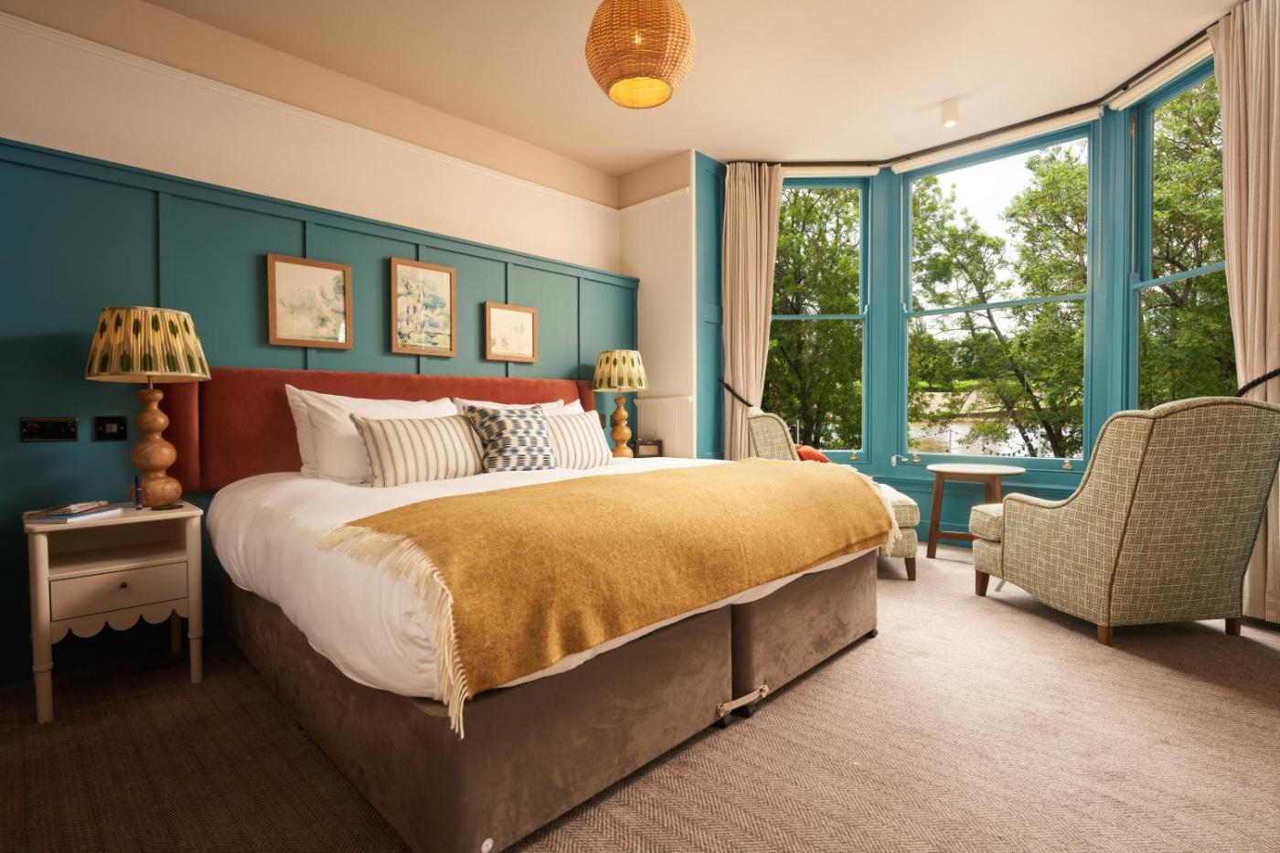 All rooms are en suite and feature hot drink making facilities including Nespresso® coffee machines, flat-screen smart TVs, luxury beds and bedding, complimentary toiletries, hairdryers and ironing facilities. Some rooms have garden and river views.