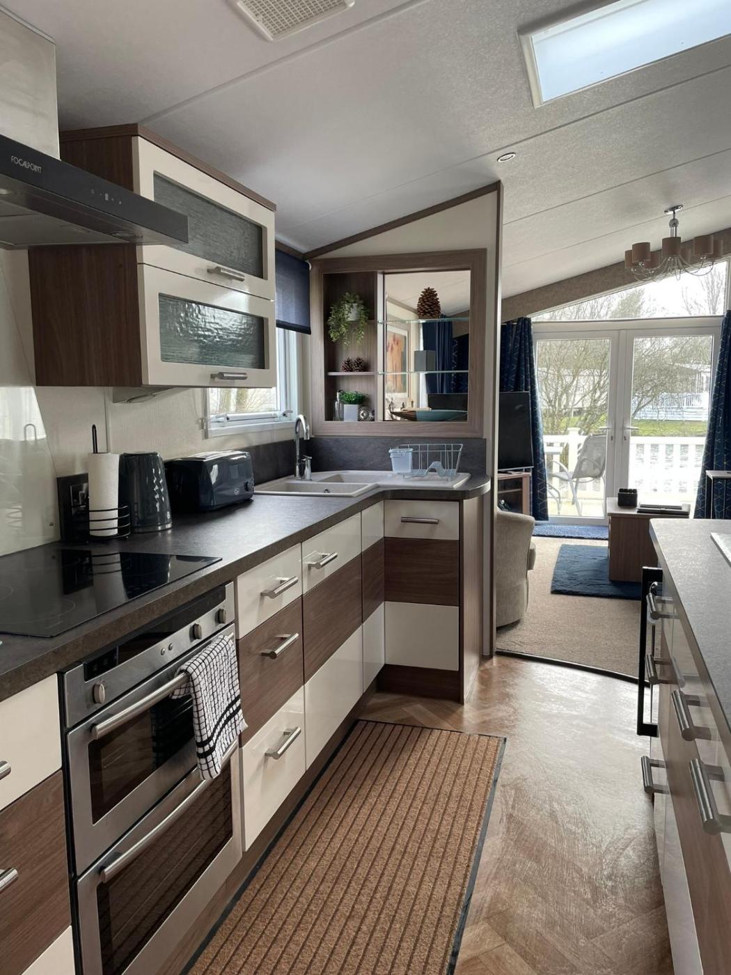 Caravan. This mobile homes special feature is the fireplace. This mobile home consists of a kitchen, a seating area, 2 separate bedrooms and 2 bathrooms with a bath and a shower. Guests can make meals in the kitchen that is equipped with a stovetop, a refrigerator, kitchenware and an oven. Featuring a balcony with lake views, this mobile home also provides a wardrobe and a flat-screen TV. The unit offers 3 beds.