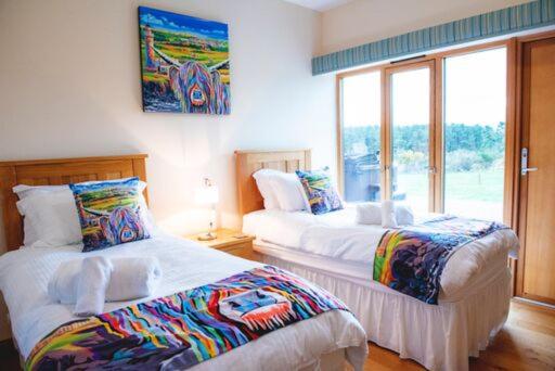 Four-Bedroom Lodge. Lodges have underfloor heating, and a fully equipped kitchen with a dishwasher and a microwave. There are three twin double rooms.The fourth bedroom offers a single bed with a pull-out bed underneath. The bathrooms feature a bath and overhead shower, with one being fully accessible. The open-plan living area offers a TV and DVD player. Guests can enjoy views of the garden from large windows. ;
