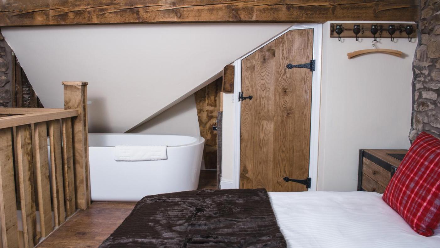 One-Bedroom Suite (2 Adults) - Snug 5. This light and airy suite features a lounge and an oak-carved spiral staircase that leads to a quirky loft bedroom with a king size bed. An en suite bathroom is included with a free standing bath in the bedroom ;