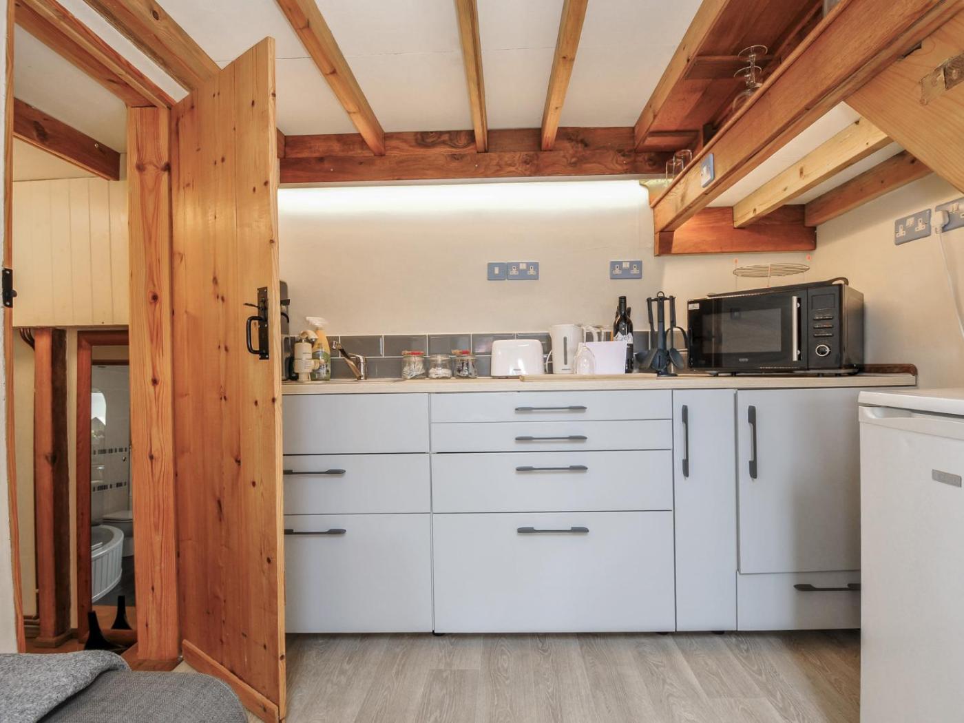 This holiday home features 1 bedroom, a kitchen with a microwave and a toaster, a TV, a seating area and 1 bathroom.