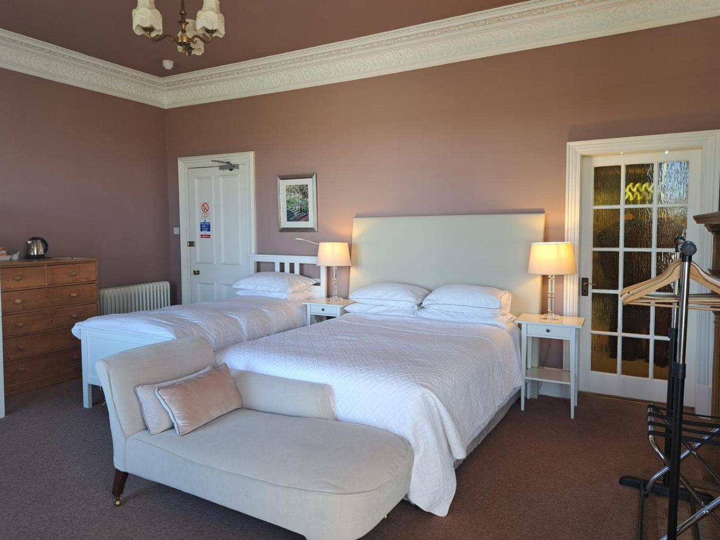 Family Room with Private Bathroom. This spacious room has a view over the golf course and race course. It features a large en-suite bath and shower room, and a sitting area in the circular window. There is a queen size double bed, a single bed and a bunk bed. The upper bunk is only suitable for children. Room features a flat-screen TV, free WiFi, tea and coffee making facilities and storage for clothing. ;
