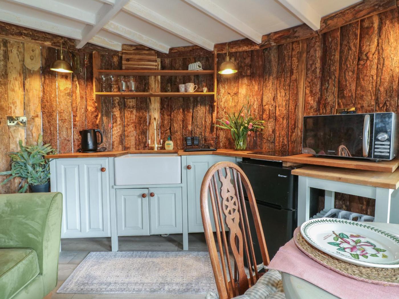 This holiday home has 1 bedroom, a kitchen with microwave, a TV, a seating area and 1 bathroom with a hot tub.