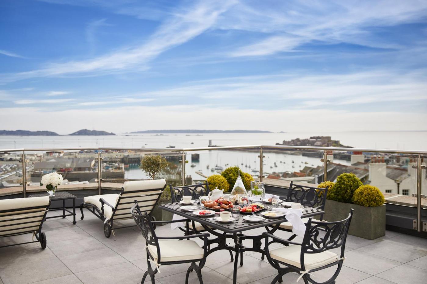 The Olive Grove, the deck and the outdoor heated pool offer wonderful views over the gardens and the harbour. The state-of-the-art Revolution Health Club is Guernseys most exclusive private gym. The luxurious spa has 2 whirlpools, a sauna and a steam room offering top-of-the-range hydrotherapy for your whole body.